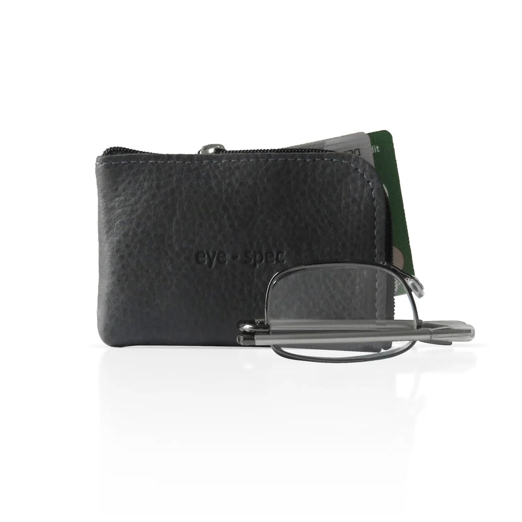 eine stilvolle faltbrille mit leichtem graphitfarbenem edelstahlrahmen und ausziehbaren bügeln. dieses brillengestell lässt sich in einem eleganten grauen lederetui verstauen. mit einer praktischen schlaufe aus metall ist das etui ebenfalls zur befestigung am schlüsselbund geeignet.